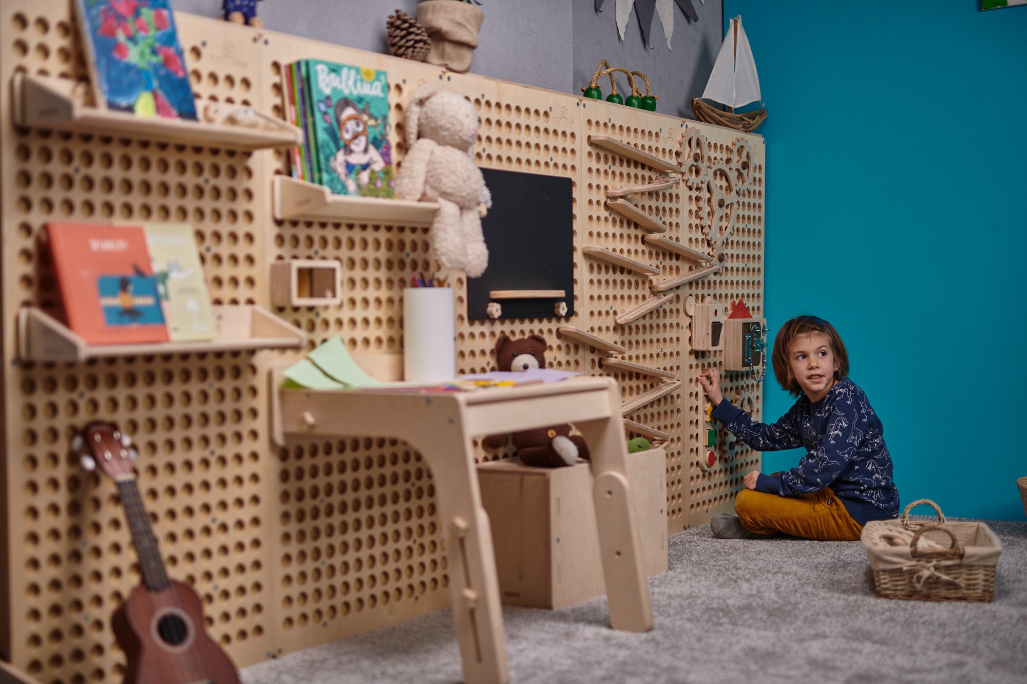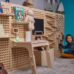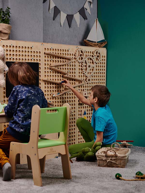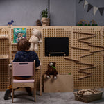 Durch die Kombination mehrerer Elemente können ganze Wandbereiche im Spielzimmer gestaltet und zu einer größeren kreativen Spielfläche verbunden werden – ideal für fantasievolles, selbstbestimmtes Spielen.