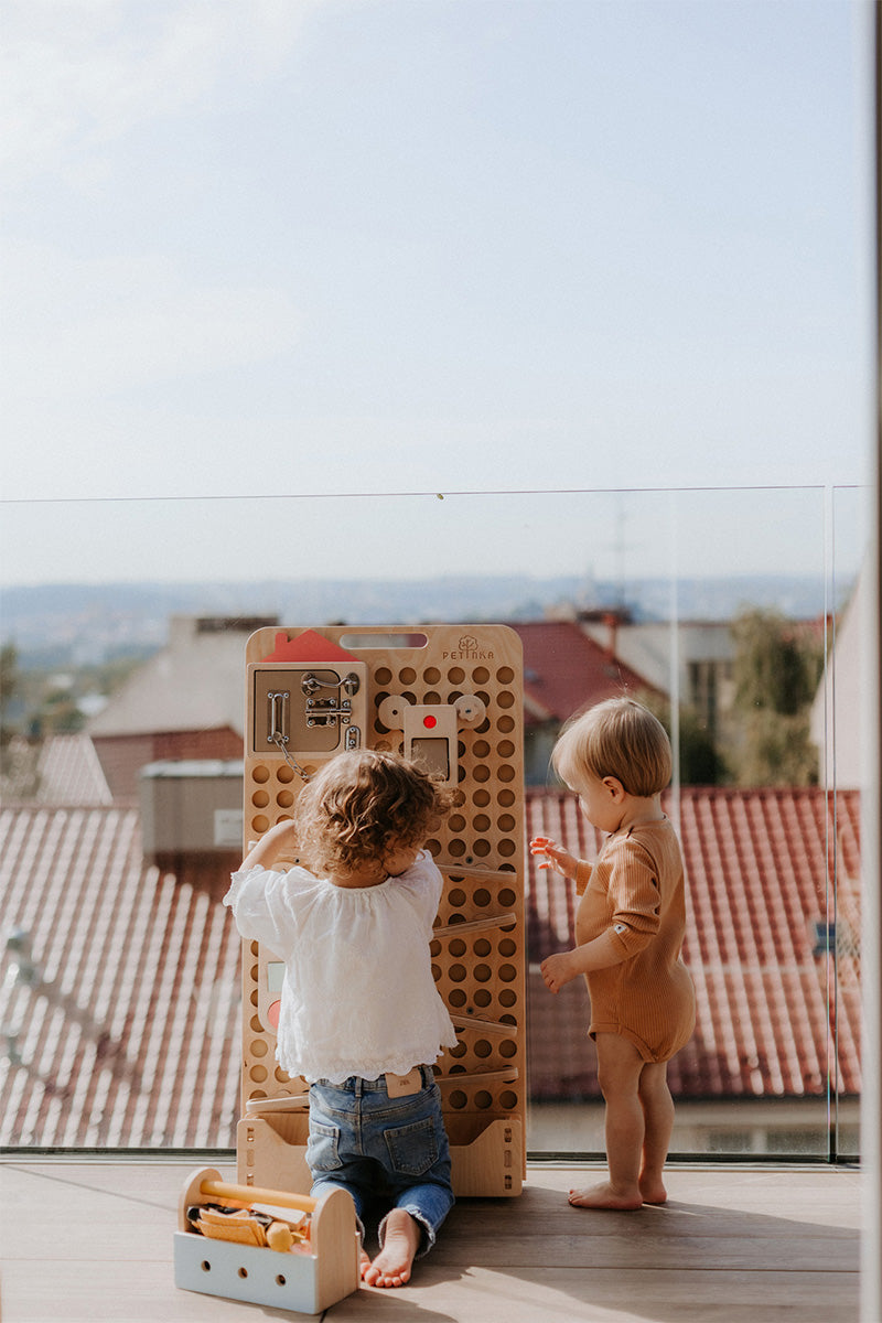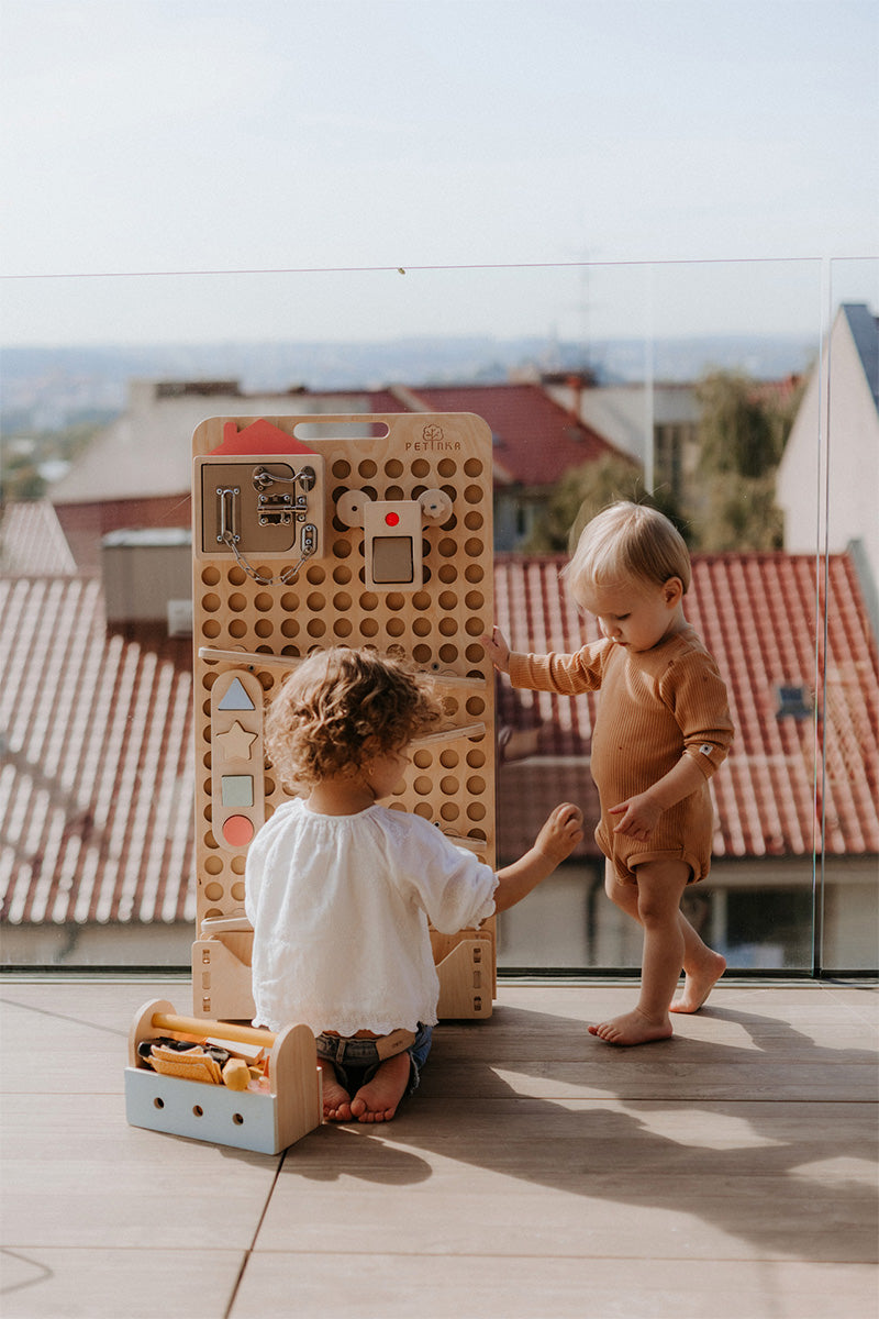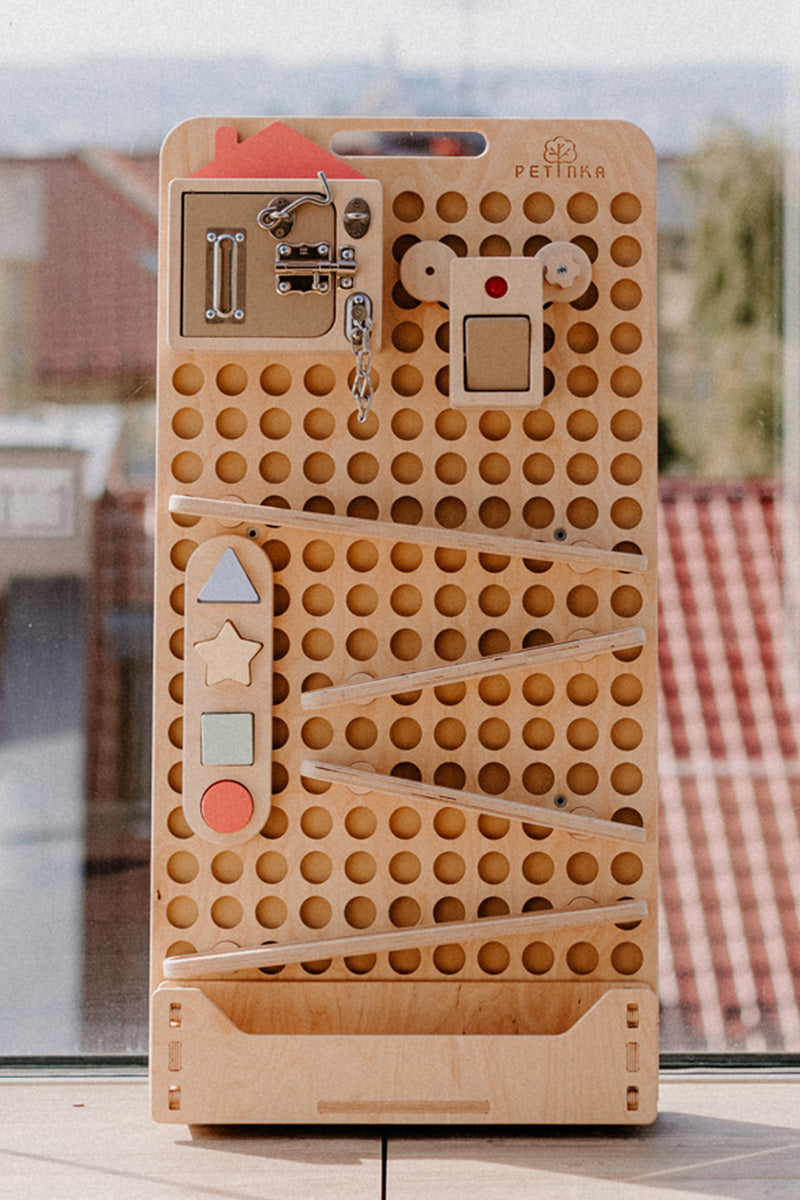 Das Ready to Activity Board (RTA) ist eine speziell entwickelte Holzplatte mit integrierter Magnetfläche, auf der einzelne Spielzeuge und Aktivitäten aus unserem Sortiment flexibel befestigt werden können.